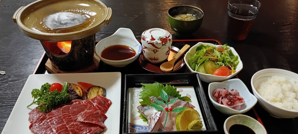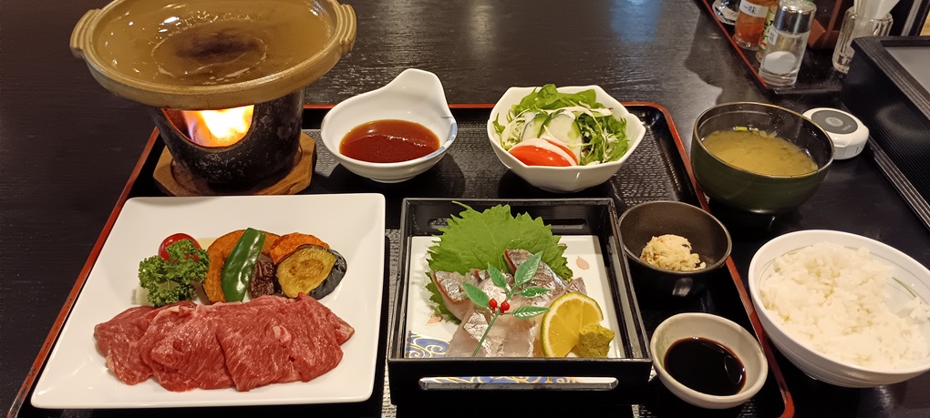 朝食と夕食はホテルで。夕食は、関アジと豊後牛ステーキにしました。古いホテルでしたが、温泉もあるので、リラックスできました。